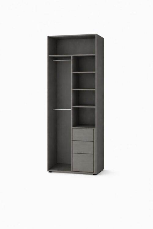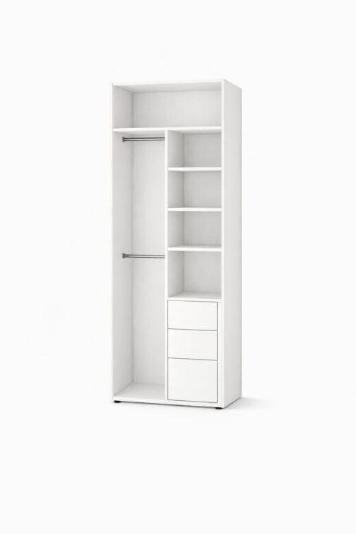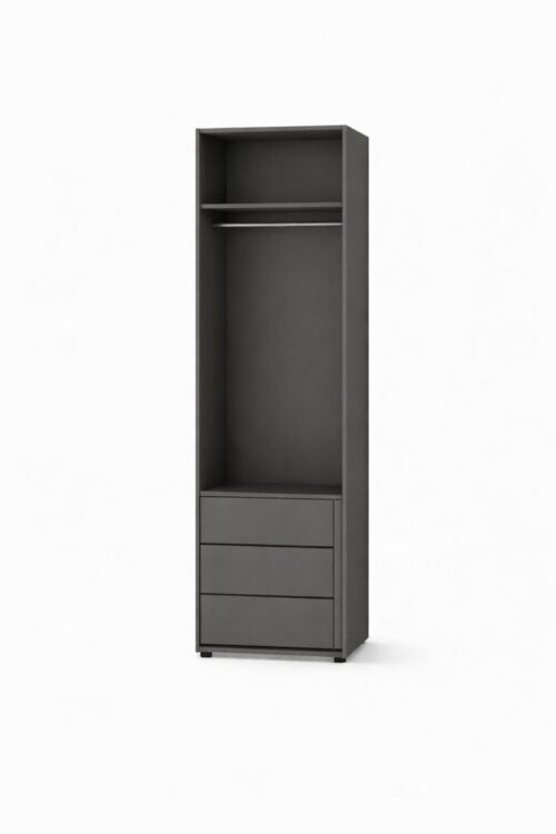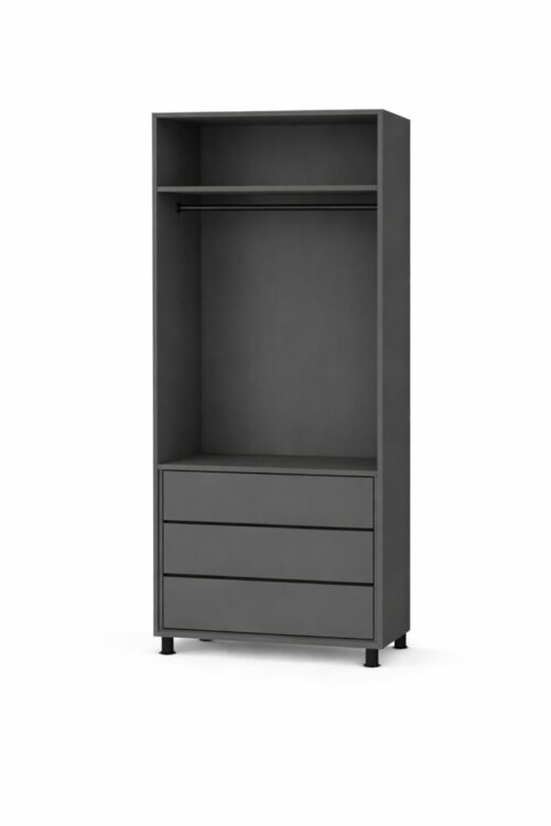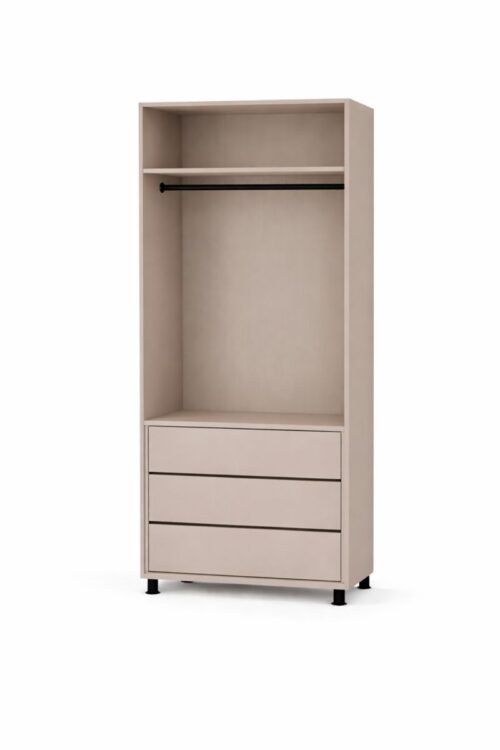 his wardrobe unit features an open hanging section with three integrated drawers below for practical everyday storage.