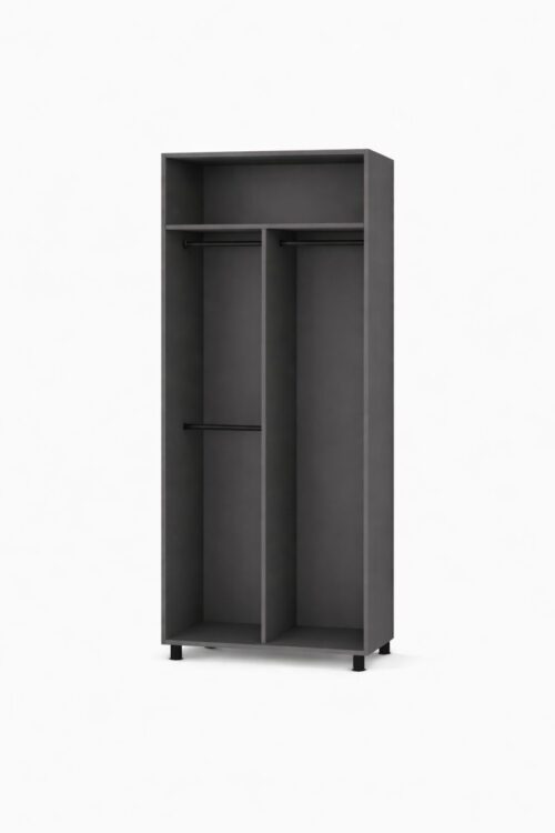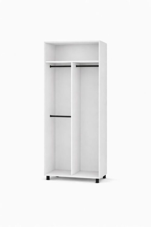 This wardrobe unit features two full-height hanging sections with a top shelf for added storage.