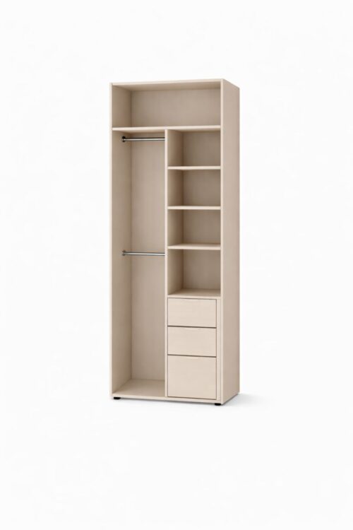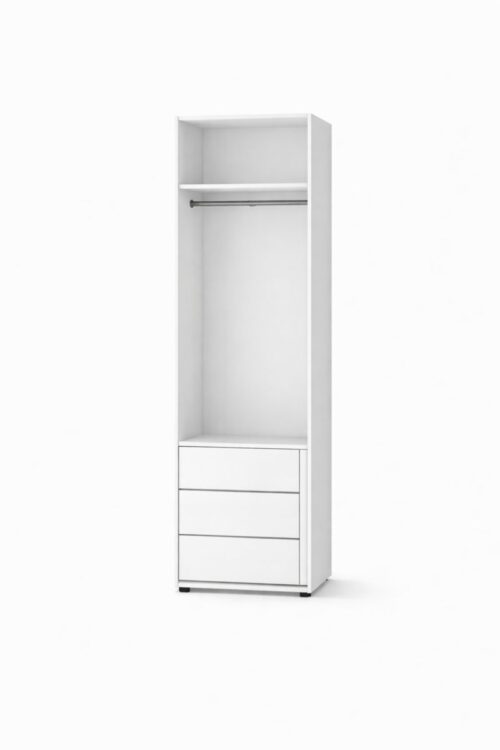 This wardrobe unit features a full-height single hanging section with a fixed top shelf, combined with three handleless drawers below for practical everyday storage.