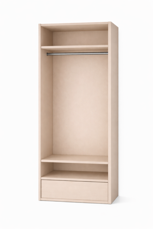 The layout features a full-height hanging section with a fixed top shelf, an additional lower shelf for folded items, and a full-width drawer at the base for concealed storage. The simple, open design keeps everything accessible while maintaining a neat, uncluttered look.