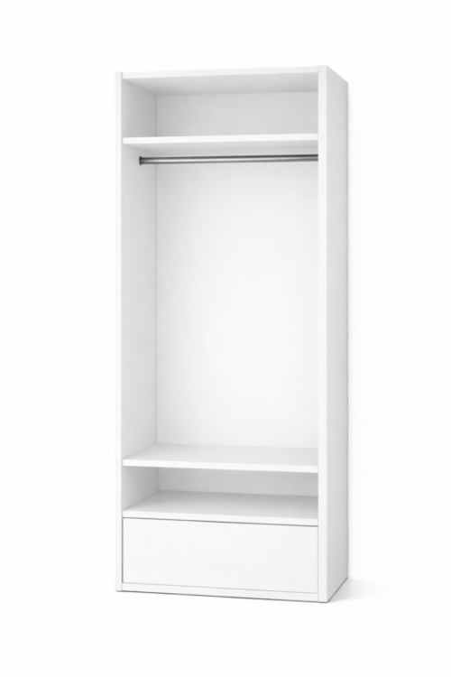 This open wardrobe unit combines hanging space, shelving, and drawer storage in one clean, modern design, making it ideal for bedrooms, dressing rooms, or walk-in wardrobes.